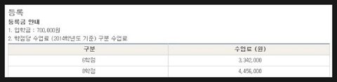 입학금은 700,000원으로 동일하지만 학점당 수업료가 다르기 때문에