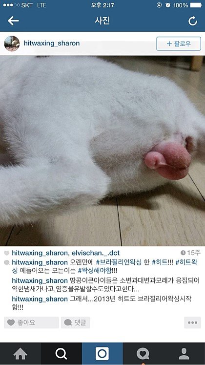 사평이 주인이 직접 올린글입니다 사진은 히트라는 자신이 키우는 고양이고거기..에 왁싱을 했데요.. 이게 말이됩니까...자기 블로그 글에서 발바닥 털 밀고 도장 찍어 타투해놨다는 글도 있고 수염이 이쁘게 나라고 수염도 뽑고.. 이분 뭡니까..이것 말고도 한두개가 아닌데 답답하네요.. 이것도 확대범아니에요??