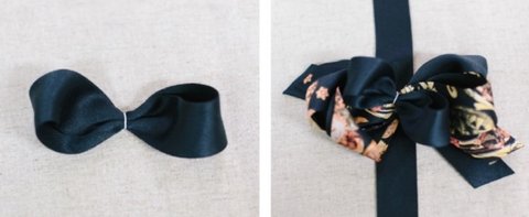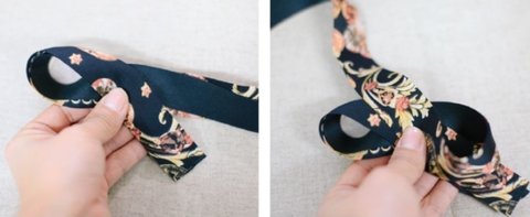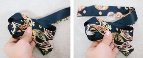 무늬가 있는 리본 (길이:75cm)을 16cm 아래로 비틀어 접고,8자모양처럼 반대편도 비틀어