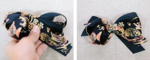 왼쪽 위로 올린 리본을 아래 뒤쪽으로 넘겨준 다음에  위로 올린 리본을 뒤로 접어주세요