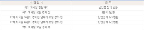 * 환불기준일자는 입학포기 및 자퇴원 제출일자를 기준으로 하고, 휴학한 자가 복학하지 않고 자퇴원을 제출한 경우 휴학일자를 기준으로