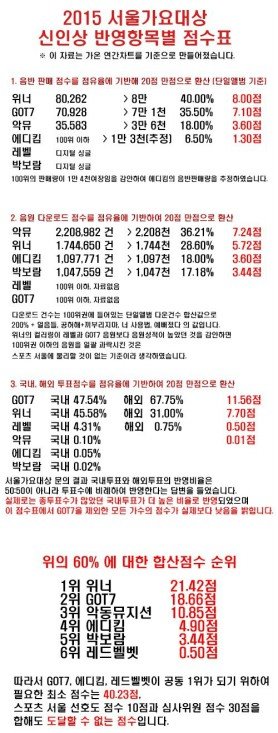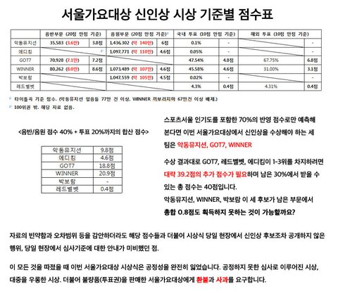 다른 가수들 상 받은걸 까내리는게 아님ㅡ 다른 가수들 상 받은건 축하함. 그런데 왜 왜 왜 위너는 안 준거임??????????? 무조건 자삭하자는 말 하지 말자. 왜 참고 있어야하는건데?????? 잘못된건 따져야함. 분석표에 있는 것처럼 말도 안되는 상황은 널리 알려서 따져야 한다고 생각함. 다만 그 과정에서 다른 가수 깎아내리거나, 위너 얼굴 먹칠할 그런 댓글이나 게시글은 절대 작성하면 안되고ㅡ 참석 못해서 안줄꺼면, 아예 처음부터 공지를 하던가, 아니면 아예 후보에 넣지를 말던가했어야지!!!! 유료 투표로 팬들이 돈 엄청 들여서 투표 했는데 그냥 그 돈들 공중분해 된거잖아ㅡ 미리 말을 했으면 팬들이 괜히 투표할 일도 없었을테고ㅡ 서가대측에서 자신들이 지칭한 '공.정.한.' 수상 선정기준을 밝혀야 한다고 생각함.