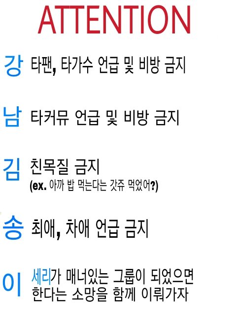 ㅇ일단은 이렇게만 적었어. 그냥 맘에 드는거 골라서 간간히 올리자. 팬은 가수의 얼굴이라는 말 기억하고 최대한 공지 지키고 매너 지키면서 팬질하자. 인클 잘하는 거잖아ㅎ 공지 조금씩 올라오는거 좋닼ㅋㅋ