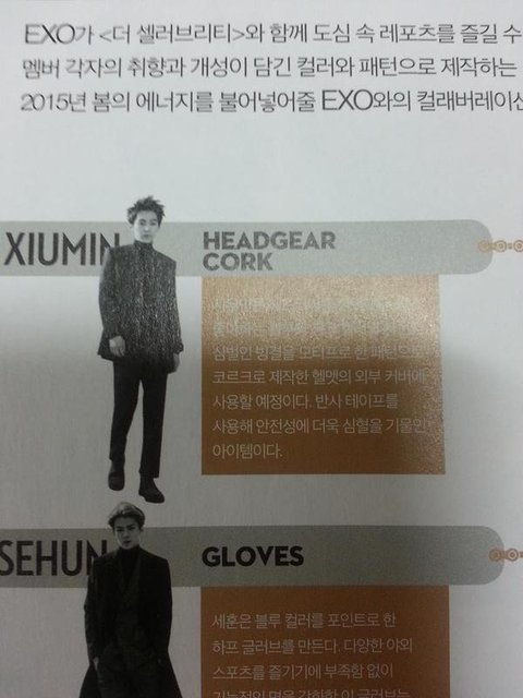 시우민은 헤드기어를 선택했다. 평소 좋아하는 블루와 핑크 컬러와 자시의 심벌인 빙결을 모티프로 한 패턴으로 코르크로 제작한 헬멧의 외부 커버에 사용하 예정이다. 반사 테이프를 사용해 안전상에 더욱 심혈을 기울인 아이템이다.-셀러브리티2월호
