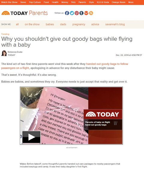 아이가 다른 사람들에게 불편함을 줄 지도 모르는것에 대해 미리 사과하며 같은 비행기 승객들에게 구디백(사탕과 귀마개)를 나누어준 두 초보 부모의 착한 행동이 요즘 많은 관심을 받고 있다.