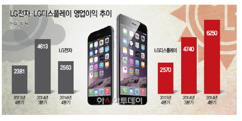 LG전자 : 4613억 -> 2563억으로 영업이익 박살LG디스플레이 : 4740억 -> 6250억으로 목표를 옛날에 넘어선 영업이익 대박* 아이폰6/6+은 LG디스플레이를 사용합니다...