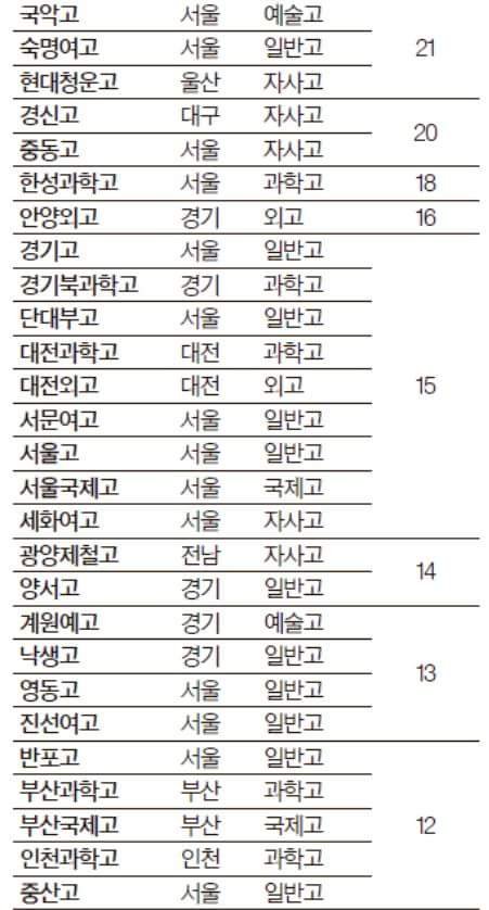 15학년도 서울대 합격생 배출 고교 최종순위