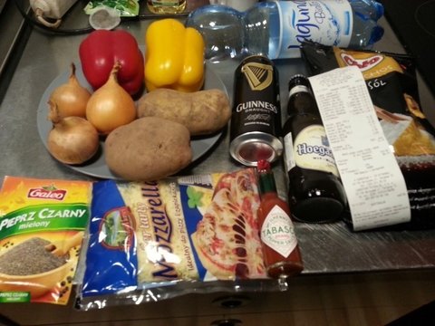 1. 1.5리터 물2. 기네스 500ml 캔3. 호가든 330ml 병4. 타바스코5. 나초 1봉지6. 후추7. 모짜렐라 치즈8. 감자큰거 2개9. 파프리카 큰거 2개10. 양파 작은 거 3개도합 9600원
