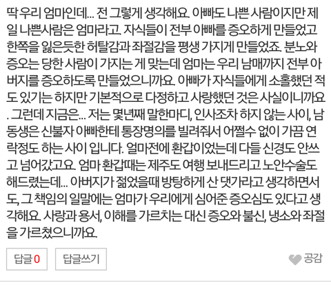 질문은 이글에 댓글들에 몇분들이 "나도 엄마가 감정쓰리게로 날사용했다 그래서 현재에 나도 뭐 좀 그렇다"이런식으로 글을 달았는데 그중에