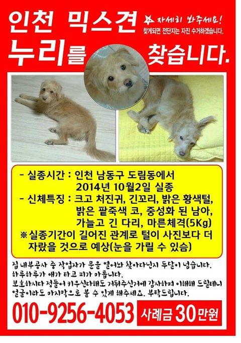 저는 2014.10. 2일에 저희집 막내 누리를 잃어버렸습니다.
