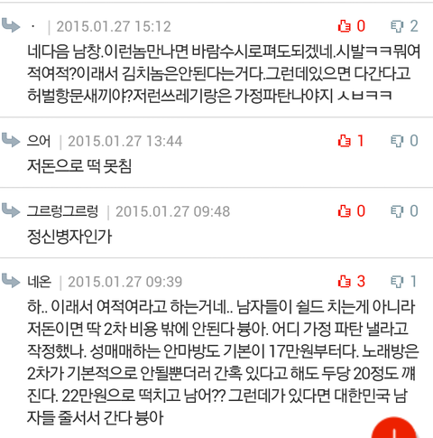 노래방 비용에 대한 고민글 내 댓글에 대한 대댓글 좀 봐 2차가는 비용이 20만원 이하면 남자들 줄서서 갈거래 ㅋㅋ