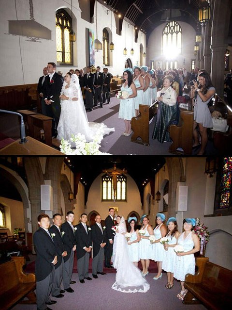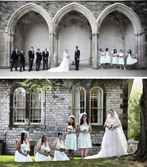 6. 웨딩 파티캐나다 결혼식에선 신부측에서는 들러리와 Maid of Honor, 신랑측에서는 그룸스 맨과 Best Man을 세워야 합니다. 원래 유럽풍습에서 들러리는 신부에게 혹시 올 저주 (대부분 결혼 못한 여자 모쏠들의 저주...)에 대비해 그것을 보호해줄 여자들이였다고 하네요. 요즘에 들러리들이란 신부쪽과 가까운 사촌들이나 여자친구들이 결혼 준비와 쇼핑등을 같이 해주는 것이고, 그룸스 맨은 대부분 그냥 결혼식 당일 사진도 같이 찍고, 손님들 접수들을 해주고, 무엇보다도 돈봉투를 지켜주는 신랑쪽 사촌들이나 친구들 입니다. Maid of Honor 는 들러리들 대장. 흔히 다른 들러리들과 연락을 해주고, Best Man과 함께 총각파티나 처녀파티를 해주고, 결혼식날 신부의 드레스를 잡아주고, 결혼증명서에 증인으로 쓰기도 합니다. Best Man도 Maid of Honor와 같지요. 대부분 Maid of Honor는 신부의 자매나 가장 친한 친구, Best Man도 신랑의 형제나 가장 친한 친구가 해줍니다. 저희는 신랑쪽에 여자 사촌들이 많아 제쪽 다섯, 신랑쪽 다섯, 도합 열명이 되었습니다. 들러리와 그룸스 맨이 많으면 결혼식이 더 북적해지고 보기 좋아요. 참고로 들러리는 이미 결혼한 사람들도 할 수가 있지요. 들러리가 저 보다 더 어리거나 이쁘면 신경이 쓰이냐는 질문도 받아봤는데, 솔직히 화장도 제가 더 많이 하고 드레스도 신부가 더 화려한데, 들러리가 제시카 알바가 아닌 이상은 다들 신경 잘 안 쓰더라고요.