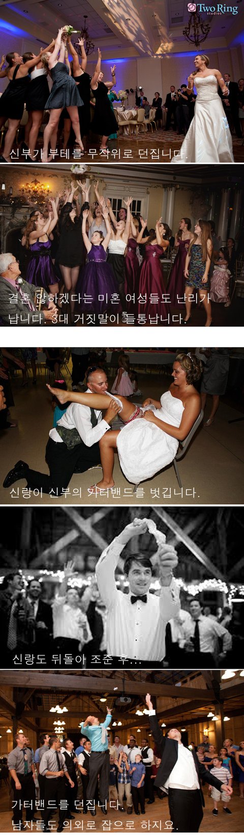 신부의 가터벨트를 입으로 벗겨서 그걸 던지는 것인데요... -_-; 나름 퇴폐적 입니다. 하객들은 열광 하지요. 사진이 있는데 제가 너무 좋아하는것 같아서 안 올리겠습니다. 사실은 신랑이 그걸 벗길 때 너무 간지러웠거든요.