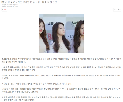 +추가)저는 이글에서 어느팬덤이라고 단 한번도 언급한적이없습니다 당사자인 걸스데이분들만 언급했어요 난독증은 병입니다 그리고 글내려달라고 하시는분들때매 한번더 말씀드립니다 저는 분명히 "걸스데이"라고 만했습니다 천천히 읽어주세요 댓글언급과 이글의 연관성을 모르겠네요그냥 걸스데이가 공식자리에서 욕을 먹었고 그에 대한 글을 올린건데.