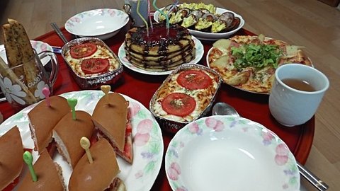 초코팬케이크,홍합찜,토마토스파게티,마늘바게트,또띠아피자,샌드위치