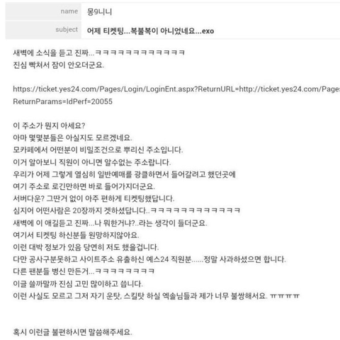 예스24는 우리를 엿먹였다 별로할말업ㅅ다 진짜 중국 여행패키지에 엑소티켓 몰래 섞어주면서 너무한다... 예스는 모래서버에 인간성도 쓰레기로구나!