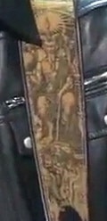 씨엔블루의 리더 정용화가 맨 기타 멜빵에 바포멧이 새겨져있다.