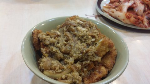 이건 일식 가츠동인데 돈까스 덮밥이에요. 수제 치즈돈까스에 맛술, 간장, 꿀, 계란으로 만든 소스를 얹어서 먹어요. 처음 만들어본거라 모양은 조금 그렇네요 ㅎㅎ;