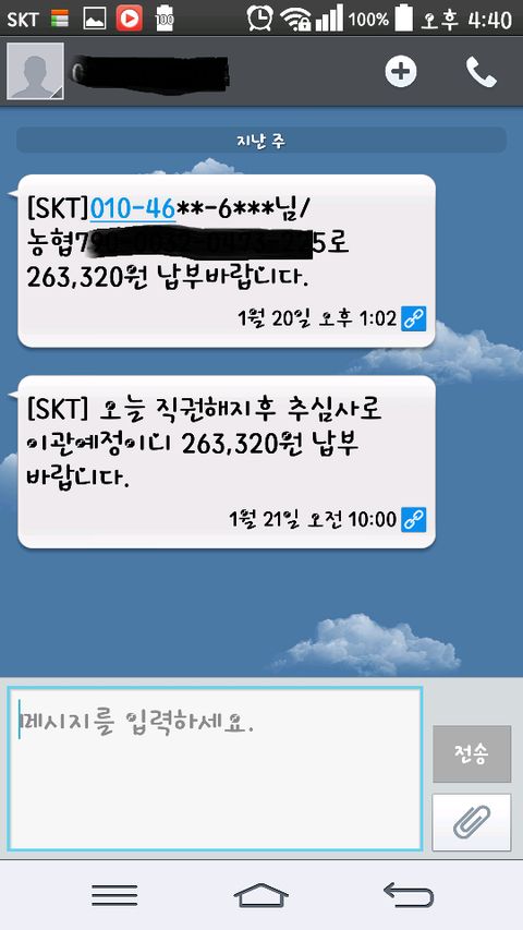 근데 사실 이해가 안되는게 핸드폰을 이걸 일시정지하고 새로운걸 개통한겁니다... 나참.. 이해가안되서.... 참고로 약정은 2년약정인걸로 알고있음 지금도. 매번 발생할때마다 핑계는 부모님.