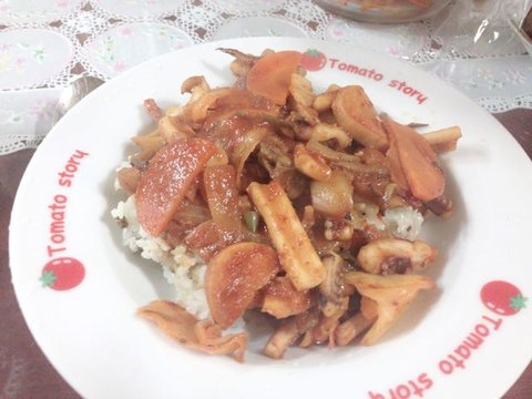 이 음식은 엄마가 어디가시면서 아빠 밥 챙겨드리러 가서 한 오징어덮밥입니다. 그래서 이것만 접시가 다르네요^^