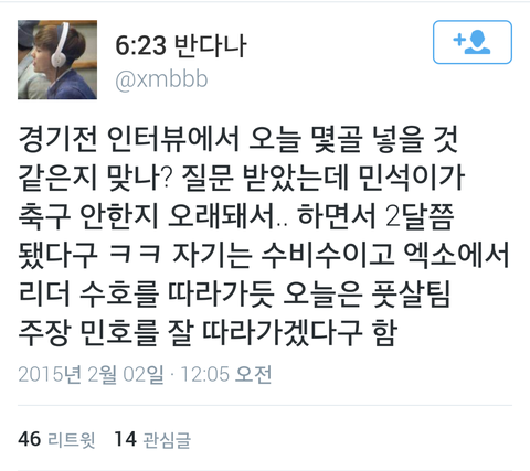 김민석 : 엑소에서 리더인 수호를 믿고 따르듯이 오늘은 주장인 민호를 믿고 @%×₩×^(수니들함성)