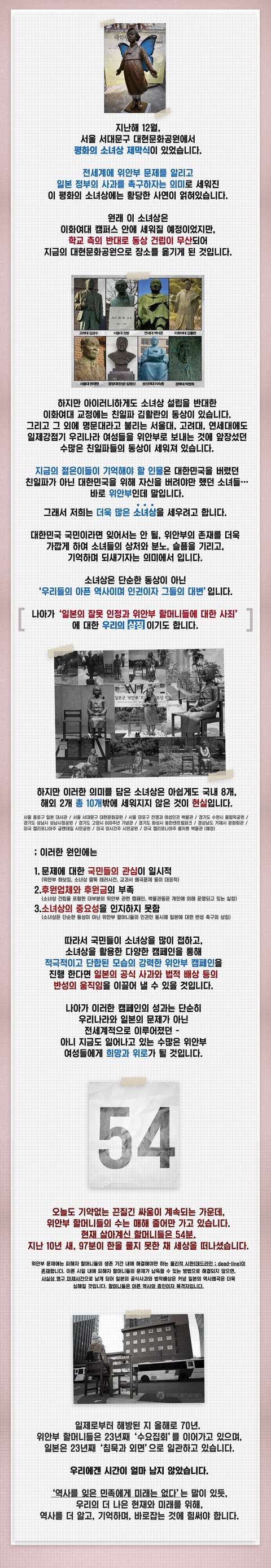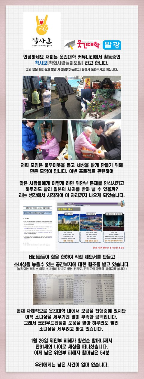 현재 웃긴대학, 오유에서 후원을 받고 있으며 네티즌들이 하나 하나 힘을 합한다면 소녀상을 세울수 있을것 이라 생각하기에 이렇게 글을 쓰게 되었습니다.