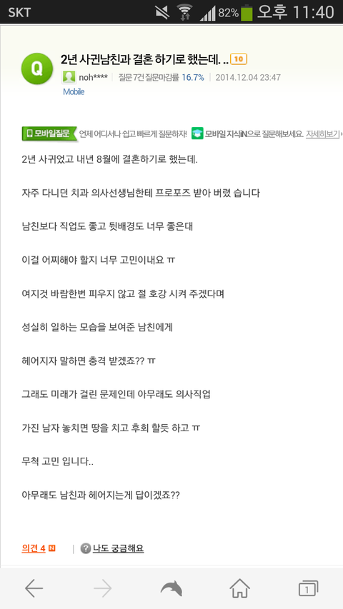 2년간 사귄 남친이랑 결혼까지 약속해놓고 치과의사한테 고백받으니 한다는 소리가 "남친과 헤어지는게 답이겠죠?"