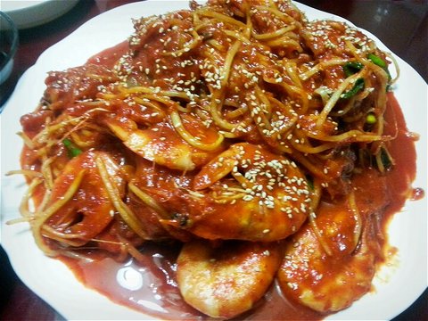 고추장 초장 (1:1) 고추가루 청양고추 간장 설탕 물엿(정말조금) 다진생강(중요) 다진마늘 양파 미나리 후추 참기름 녹말가루 콩나물 그리고 해산물들. 들어가는건 별거없어요. 고추장 베이스만 1:1 로 정해놓고 나머지는 고추가루양은 딱 정해 놓고 쓰질 않아서 어떻게 말해드리기 어렵네요. 콩나물은 해산물 삶고 남은 물어 삶아주세요. 마지막에 녹말가루는 물에 풀어 사용해주시고요.어느 음식점에가면 그냥 하시던데 그렇게하면 좀 뭉치기도 하더라구요