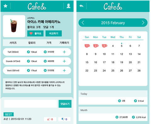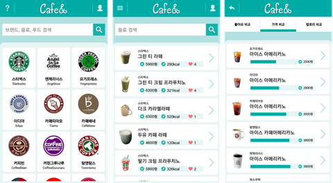 Cafe&이라는 어플인데 밑에 사진처럼 커피 가격이랑 칼로리같은걸 손 쉽게 찾아볼 수 있어요