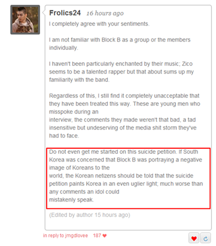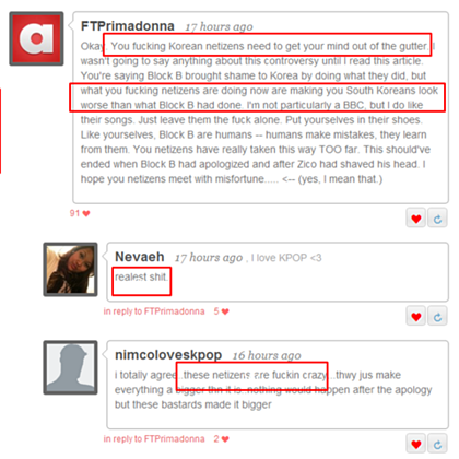 *한국 네티즌들은 한국을 망신시켰다. 위선자들. 블락비가 한국을 망신시켰다고? 네티즌들의 유치하고 미숙한 행동이 훨씬 더 국제적인 망신감이다. 블락비를 비난하기 전에 자기 자신들을 돌아봐야 한다.