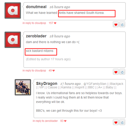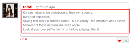 *미친 한국 네티즌들은 정신을 차려야 한다. 너희들은 블락비가 나라망신 시켰다고 하지만 내가 보기엔 너희가 하는 짓거리가 블락비 사건 보다 훨씬 더 나라 모욕을 준다.