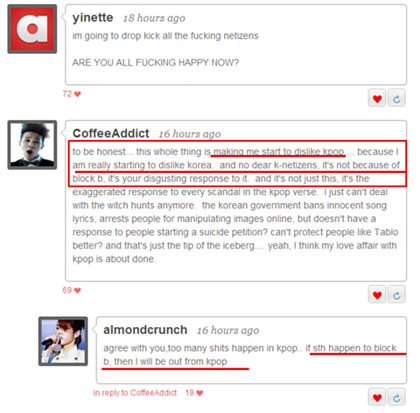 *솔직히 말하자면... 나는 이 사건 때문에 케이팝이 정말로 싫어질려 그런다... 왜? 한국이 너무 싫어져서... 아 오해하지마 - 전혀 블락비 때문에 그러는게 아니라, 한국인들의 구역질나는 반응 때문이야... 블락비 사건도 그렇지만, 다른 케이팝 아티스트의 경우에도 이랬잖아... 한국인들의 마녀사냥.... 끔직해서 더 이상 보기 싫다. (타블로 관한 글 생략) 난 이제 진정 케이팝과 이별의 시간이 온것 같다.
