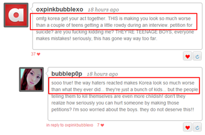 *한국이 블락비의 인터뷰 문제로 나라의 이미지가 깎였다고 생각한다면 큰 오산이다. 오히려 한국 네티즌들의 태도와 반응이 한국의 이미지를 크게 깎었다.