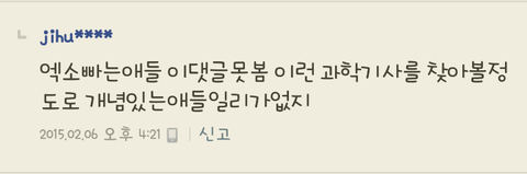 우선 내가 이런 글을 보게된 계기를 써야겠음. 나는 평소에 인터넷기사 보는걸 좋아해서 여느때와같이 네이버 메인기사를 보고있었음. 기사제목 및 내용은 타이탄이라는 위성에 대한 글이였음. 그래서 '음..그렇구나'하면서 계속 스크롤을 내리는데 ㅈㄴ뜬금없이 '그리고 엑소는 군대를 가야한다고 생각합니다'라는 댓글이 추천수 1위인거임..아 물론 이딴댓글 옛날에 많이봤었는데 가망소및안티가 한짓이라고 정정기사 난지가 언젠데 이런게 추천수1위라는게 믿겨지지가 않는거임..