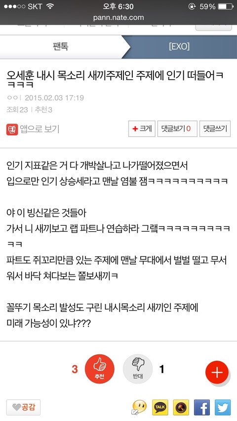 내가이번에 월급타고 설보너스받으면 너탈판하게 만들어줄께 앵간치 설치고 나대라 콘서트도못가는데 너위해 투자할께