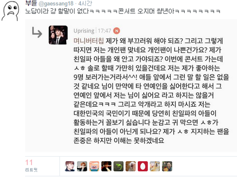 조카 빡치는데 이제 어떻게 받아쳐서 욕해줘야 될지도 모르겠다 ㅅㅄㅄ시발 콘서트 오지마라 진짜 ㅅㅂ