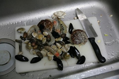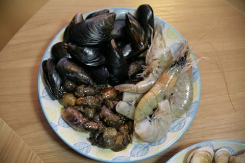 홍합과 조개류는 수세미로 깨끗히 청소했습니다.