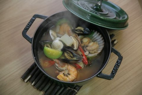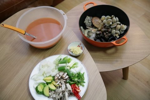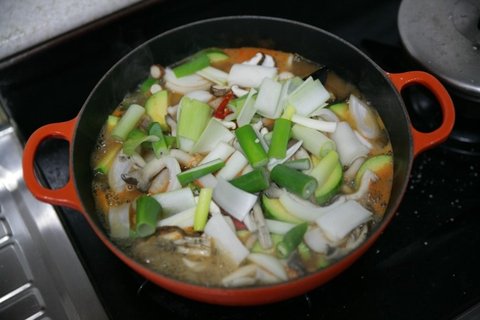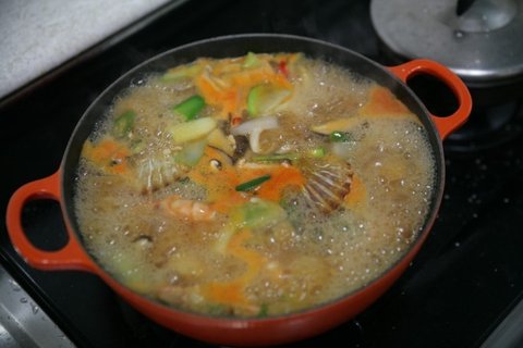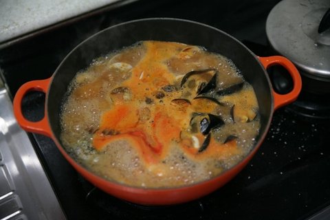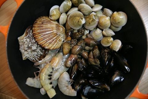 주물냄비에 해산물들을 넣어줍니다./