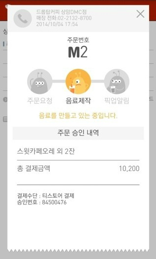 원하는 카페와 메뉴를 선택하고 결제를 하게 되면,