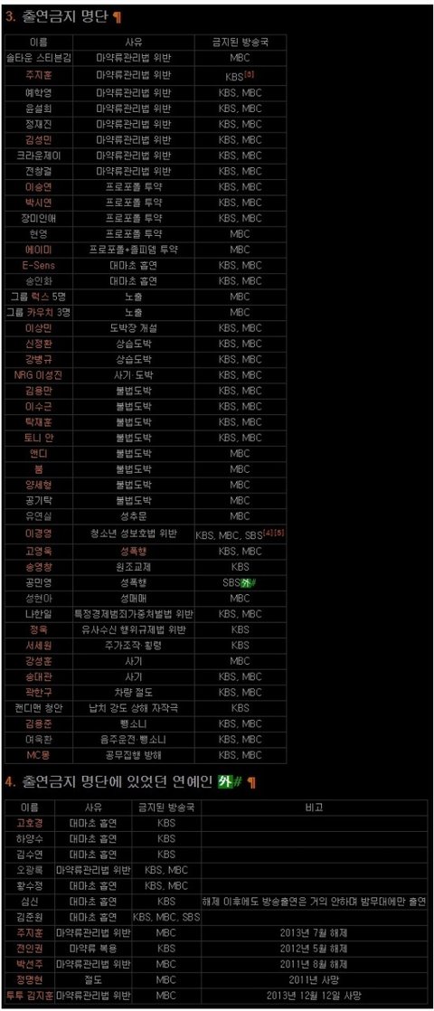방송 출연금지 연예인 명단