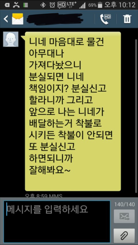 부모님이 CJ택배 하시는데 60세되신 부모님에게 S편의점 알바하는 30대초반 여자가 반말로 이런 문자를 보냄. 정말 개념상실한 여자... 요즘 편의점들은 택배기사가 택배맡기러오면 오히려 더 좋아함. 와서는 택배만 찾아가기보다 물건 하나라도 더 사간다고 더좋아함. 그런데 이런 여자가 있을줄은 상상도 못함..