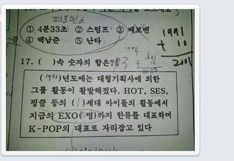 저거 몇몇사람들이 엑소 멤버수를 왜 알아야되냐고 따졌었나? 암튼 그래서 문제 출제 선생님이 시험전에 12명이라고(..씁쓸) 계속 알려줬다고 저학교 학생이 해명했었음