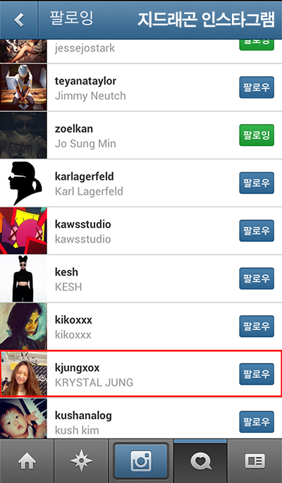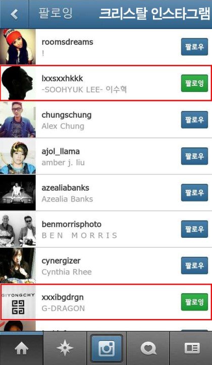 그런데 어느날 위 사진엔 안 나왔지만 모델이수혁님과 gd가 크리스탈을 팔로우함....