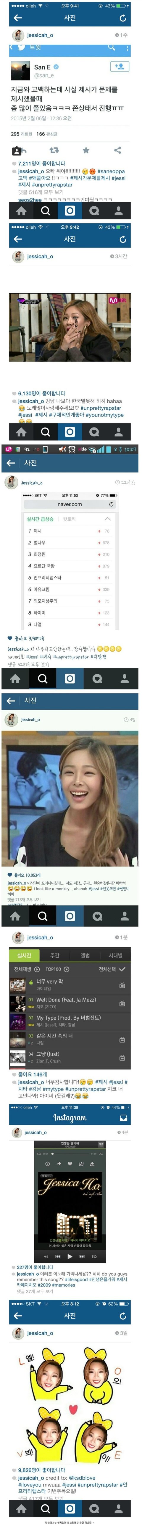 진심 개착함 자기 관련된 인스타 글들이랑 페북 글들에 일일이 다 좋아요 눌러주고 팬들 댓글에 답글도 달아줌 ㅜㅜ 언프리티에서 모습으로 많이 오해하고 있는 사람들 많은데 제시 정말 착하고 좋음.. 나 제시가 팔로우한 제시 팬스타그램 운영하는 사람인데 매번 글마다 좋아요 다 눌러줌