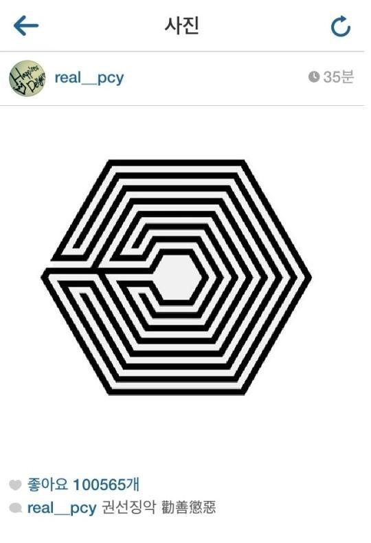 4. 찬열 인스타그램에 올라온 엑소 로고와 권선징악이라는 단어.