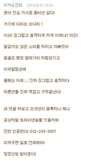 하... 이젠 이런식으로 까대네 쟤 다음텔존에서 윤아안티질하다가 네이트와서 윤아베플악플로 조작하는 인지도잖아요, 작년이랑 제작년에 판했다면 다 알면서진짜