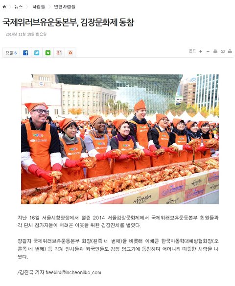 지난 16일 서울시청광장에서 열린 2014 서울김장문화제에서 국제위러브유운동본부(장길자회장님)회원들과 각 단체 참가자들이 어려운 이웃을 위한 김장잔치를 벌였습니다.장길자 국제위러브유운동본부 회장(왼쪽 네 번째)을 비롯해 이배근 한국아동학대예방협회장(오른쪽 네 번째) 등 각계 인사들과 외국인들도 김장 담그기에 동참하며 어머니의 따뜻한 사랑을 나눴습니다.