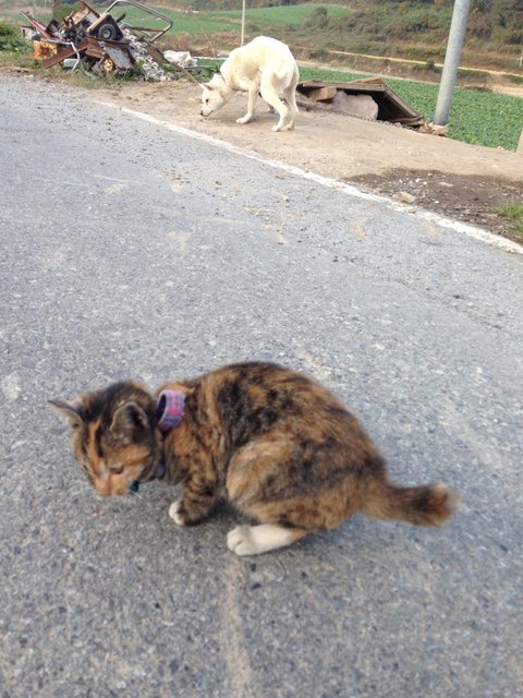 고기를 많이 챙긴 덕분에 백구에게 배불리 주고 있는데 제 다리 밑에 뭔가가