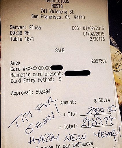 지난 2일에도 캘리포니아주 샌프란시스코의 식당에서도 비슷한 일이 있었습니다. 이름이 알려지지 않은 한 점원은 50불어치 음식을 먹은 손님으로부터 팁 2000달러 받았습니다.고액 팁을 준 손님은 하나같이 영수증에 '팁스 포 지저스'(Tips for Jesus)라는 문구를 남겼습니다. 예수님 이름으로 팁을 주겠다는 뜻입니다. 이들은 결제 사인 위에 문구를 쓰거나 도장을 찍었습니다.