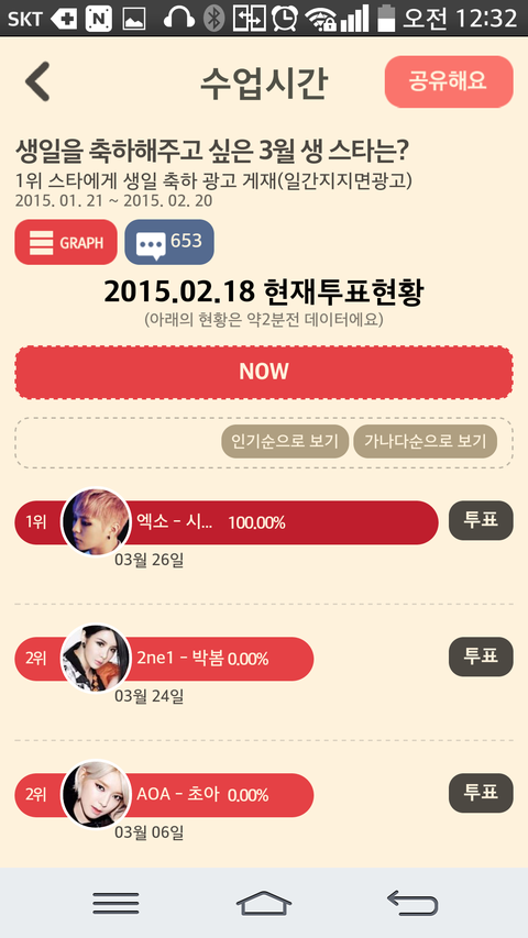 0시 30분 쯤 팬스 투표하러 들어갔더니 또 100퍼더라구. ㅋ 지금은 투표율 바뀌었지만 볼때마다 뿌듯함. 투표가 20일까지니까 이제 이틀 남았어. 전면광고 얼마나 이쁠까 기대하는 중임. ㅋㅋㅋㅋ 암튼 마지막까지 마무리 잘 하자구. 나도 몇 시간 뒤에는 할머님댁에 갈 꺼야. 웅녀들도 설날 가족과 함께 행복하게 보내!!!!!!